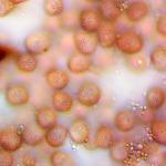 Rozīgais ragansviests Fuligo septica var. rosea, sporas 1000x palielinājumā, 2020.