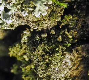 Sporas: 10-15 µm, ar skaidrām adatiņām; tumšas, viena puse gaišāka; apaļas un iegarenas Atsevišķi puslodveida (d=0,2-0,8 mm) un nedaudz izstiepti, izlocīti augļķermeņi (līdz 2 mm). Krāsa vienam augļķermenim dažāda - gan dzeltena, dzeltenbrūna, gan zaļganpelēka (zaigojoša), ar baltiem vai gaišdzelteniem, gareniem kaļķa sakopojumiem. Virsma izskatās grubuļaina. Kapilīcija mezgli balti, dzelteni vai oranžīgi. Aug uz dzīvu koku mizas. Par šo sugu pasaulē nav līdz galam skaidrības, jo ar šādu zinātnisko nosaukumu tā aprakstīta gan uz dzīviem kokiem (te aprakstītā - ss. Neubert, Nowotny & Baumann), gan uz kritalām, kas patiesībā drīzāk ir divas dažādas sugas. Latvijā pirmoreiz novērota 2025. gadā - augustā Rīgā, uz dzīva bērza daudzstāvu ēku pagalmā un septembrī Jumpravas pag., uz dzīvas ābeles mājas pagalmā. Abus novērojumus veica Julita Kluša. Sastopamība (novērota) Latvijā: ļoti reti. Atradnes pēc Dziedavā publicētajiem foto: ![]()