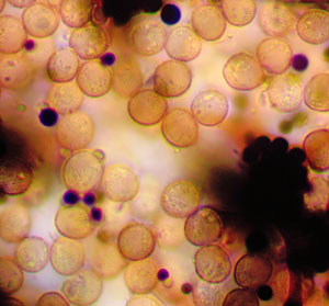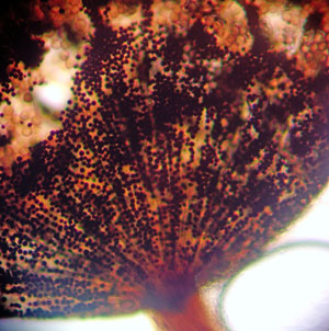 Sporu stadijā saglabājas kausiņš un perīdija tīkliņš ar izteiktiemm uzbiezinātiem mezgliem, ar 2-4 µm lielām granulām.