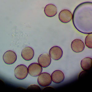 Stumbrsūnu pumpurīte Physarum bryocorticola; sporas 1000x palielinājumā, kārpainas, ar dīgļa poru, 2025.