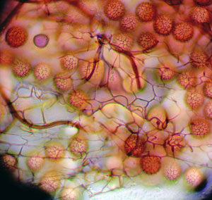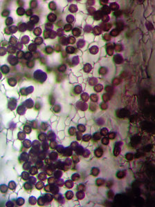 Lapu vālenīte Stemonitis foliicola ; sporas ar tīkliņu, 1000x palielinājums, 2024 . Komentēt (0) Foto: Julita Kluša