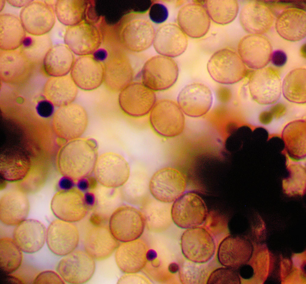 Lodbumbiera lākturīte Cribraria piriformis var. notabilis; sporas un granulas