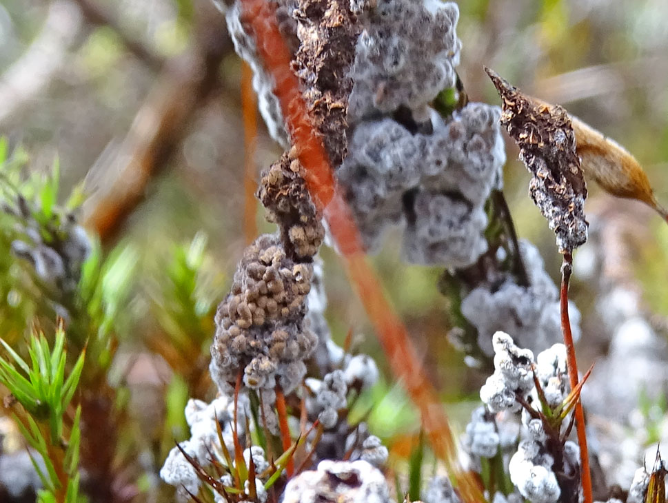 Brūnganā olīte Diderma simplex - cauri pelējumam saskatāmi cieši, brūngani augļķermeņi