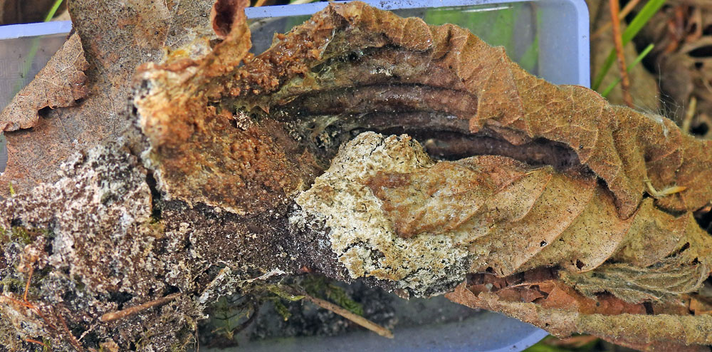 Vidējais ragansviests Fuligo intermedia starp lapām gandrīz neievērojams