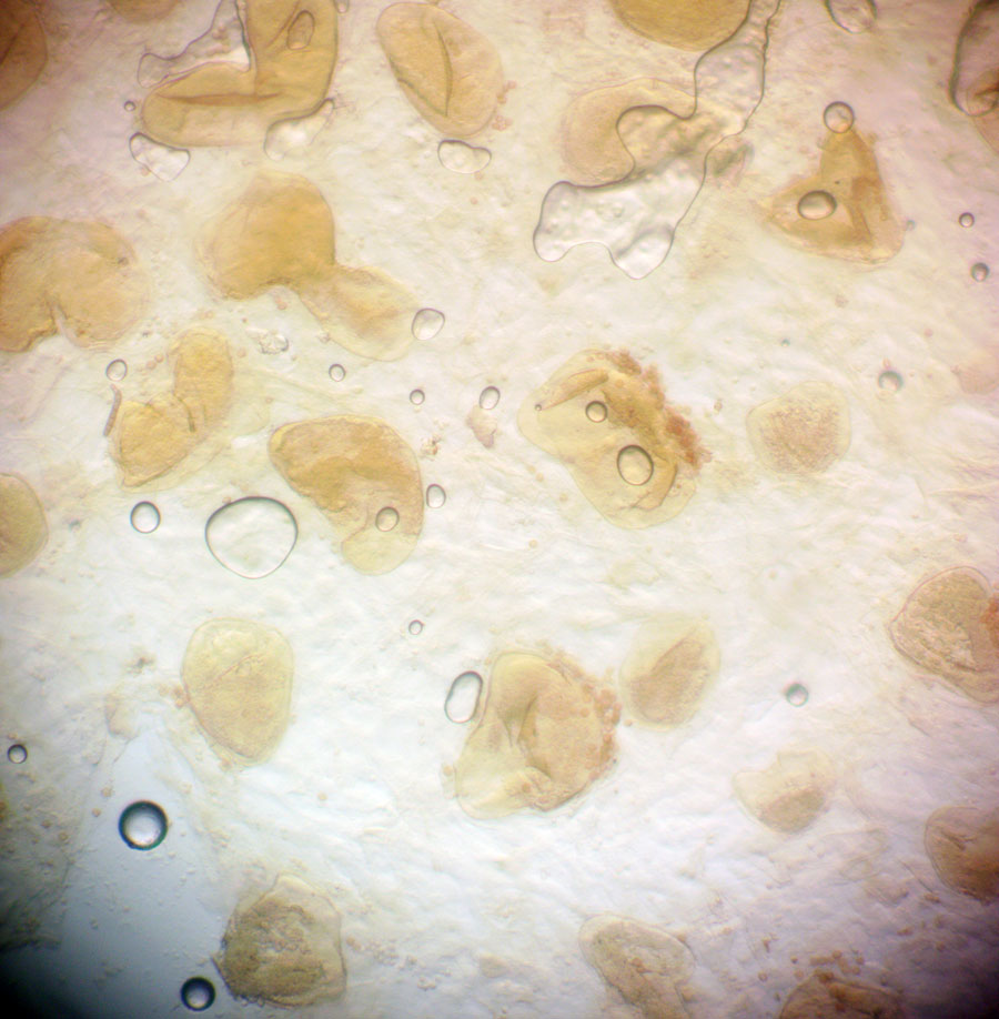 Medainā vilkpienaine Lycogala melleum, perīdijs ar pūslīšiem 400x palielinājumā
