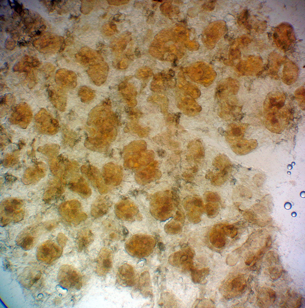 Tumšeļļainās vilkpienaines Lycogala fuscoolearium perīdijs ar pūslīšiem, kuros redzama eļļa