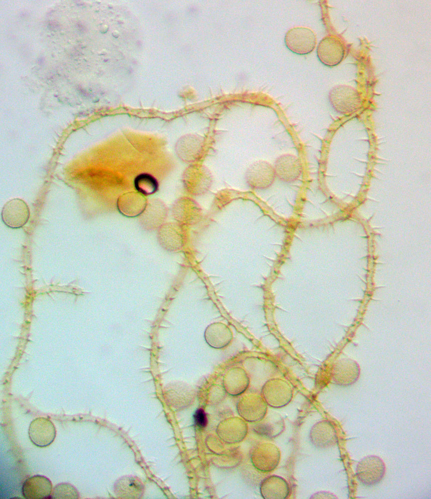 Zeltsporu čūskaine Ophiotheca wrightii, kapilīcijs un sporas 400x palielinājumā