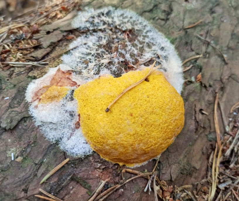 Dažādsporu ragansviests Fuligo licentii; jauns, uz priedes kritalas mizas