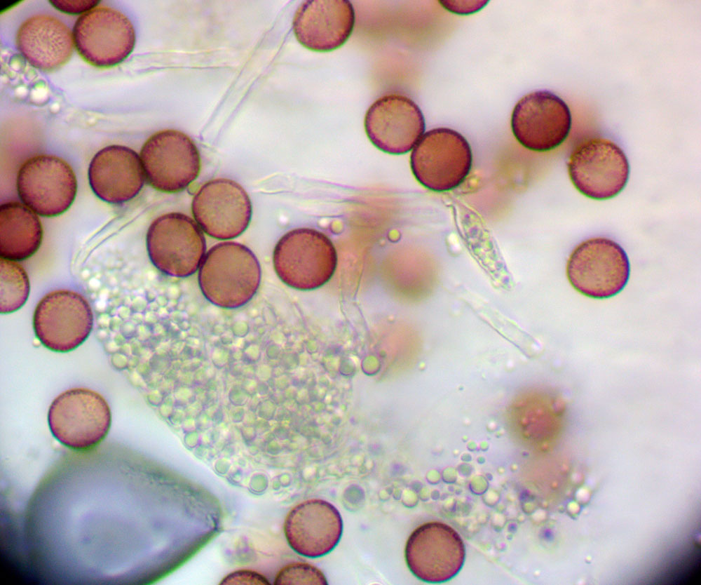 Parastais ragansviests Fuligo septica, kapilīcija mezgli ar baltām granulām, un sporas