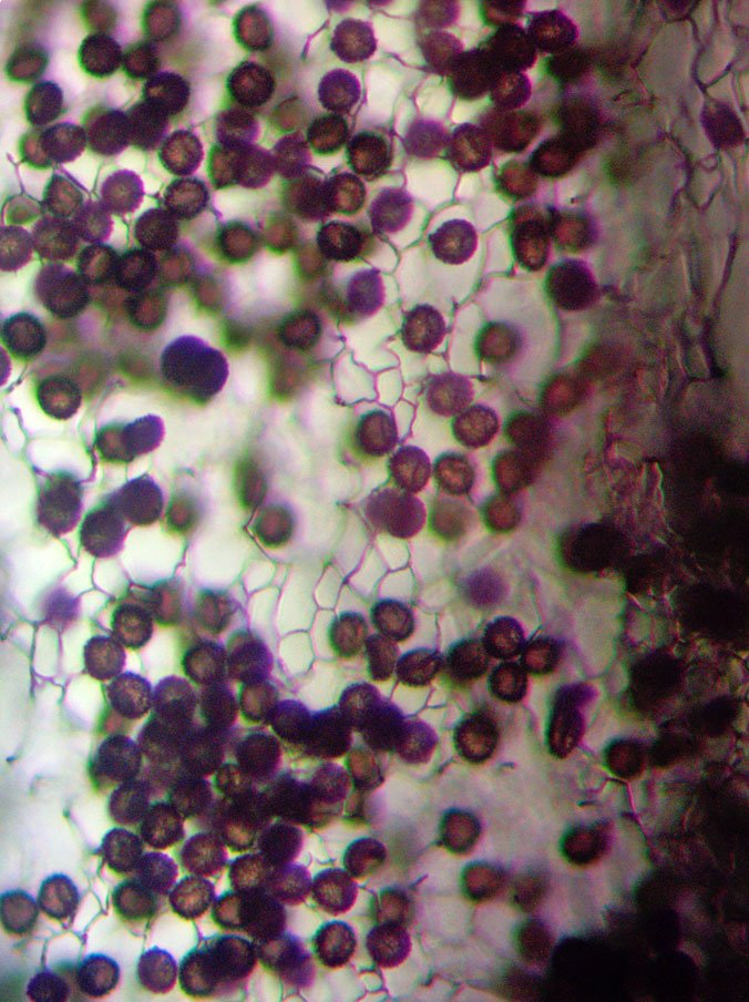 Lapu vālenīte Stemonitis foliicola, vālītes ārējais tīkliņš smalks; ar sporām