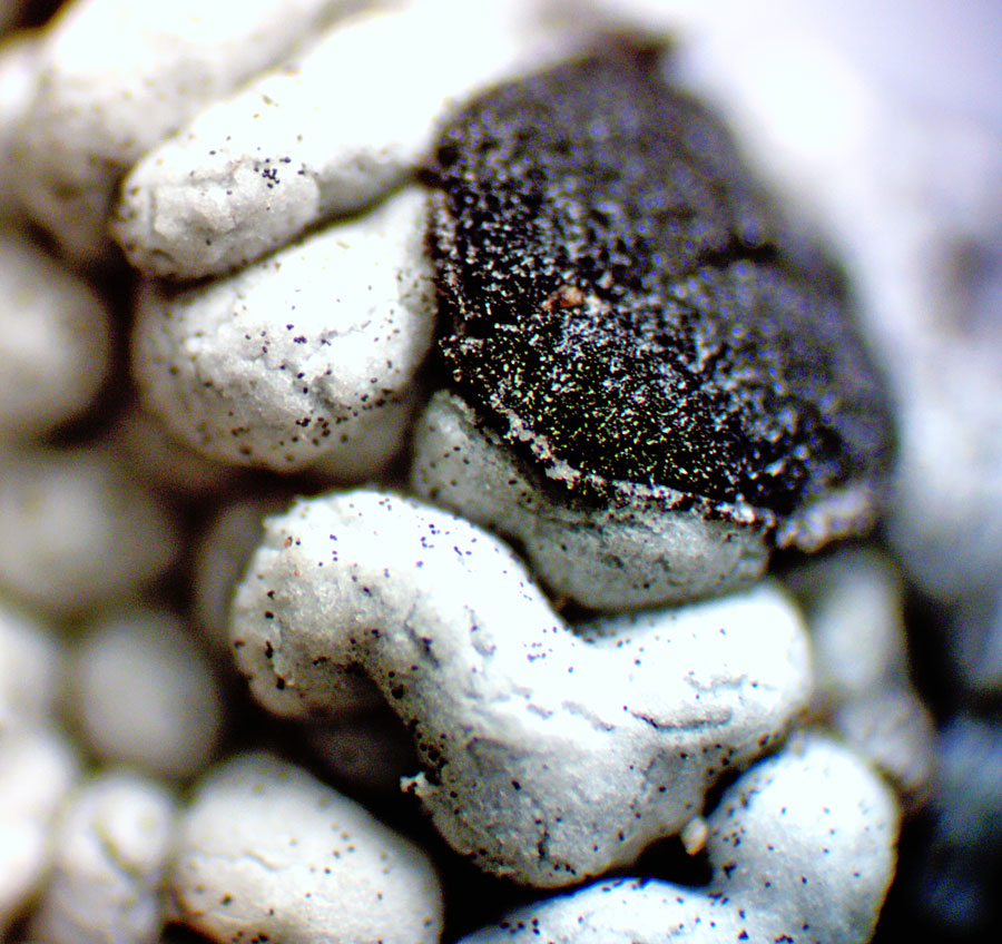 Kvēpu akolija Acolium inquinans, apotēcijs tuvplānā