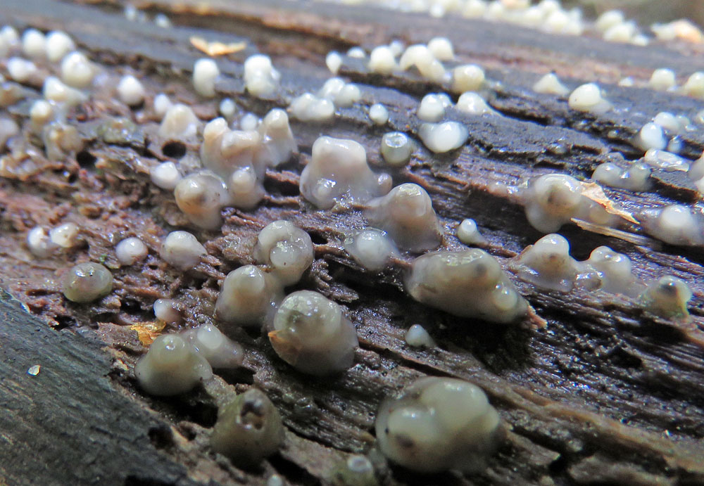 Sēne Helicogloea compressa mitrumā, tuvplānā
