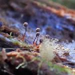 Gļotsēnes uz gariem kātiņiem un ar apaļām brūnganām galviņām.