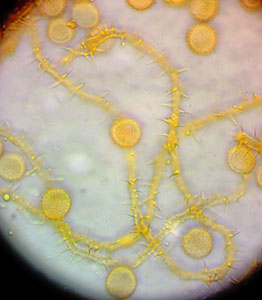 Zeltsporu čūskaines Ophiotheca wrightii sporas un kapilīcijs 1000x palielinājumā, 2024.