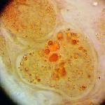 Gandrīzsajaucamā vilkpienaine Lycogala paraconfusum, pūslīši ar eļļas pilieniem un divu veidu apmalēm, 2025.