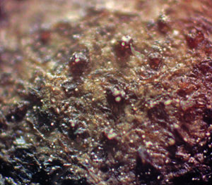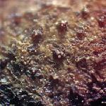 Mikroskopijā galvenā pazīme, ka pūslīši ir divu veidu - lielie D~100-200 µm, brūni, ar biezu (5-20 µm), brūnu apmali, tiem apkārt mazie (D~30-50 µm), daudz gaišāki, ar plānu apmali (1-2 µm), veidojot arī neskaidru tīklojumu.