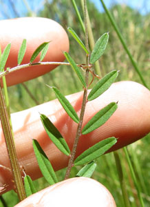 Šaurlapu vīķa Vicia angustifolia lapa salikta vairākām šaurām lapiņām, 2015.