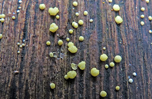 Baltas, balti pelēkas, neregulāras formas sēnes, kuru diametrs 1-3 mm, aug grupās uz trūdošiem kokiem. Sēnes viscaur noklātas ar tumšiem aplīšiem, kas izskatās kā poras, bet ir izaugumi, kas uz vecumu kļūst zaļi.