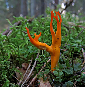 Lipīgā zaraine Calocera viscosa starp sūnām, 2015.