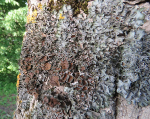 Kausveida pleurostikta Pleurosticta acetabulum, bagāta ar apotēcijiem, 2017.