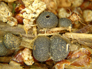 Izcilnētā vilkpienaine Lycogala convexum, virsma tumša ar pūslīšiem, 2025.