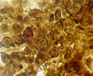 Izcilnētās vilkpienaines Lycogala convexum pūslīši caurejošā gaismā ir tumši, ar tumšu apmali, 2025.