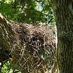 Ligzdo mežos vecos kokos, ligzda parasti uz zara, nost no stumbra.