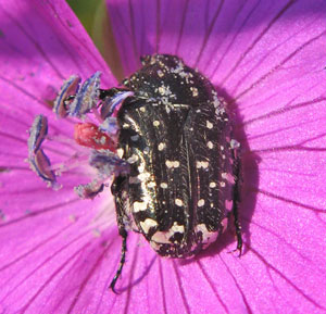 Smirdīgā rožvabole Oxythyrea funesta gerānijas ziedā, 2011.