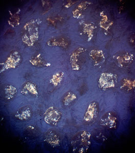 Dzintarainā vilkpienaine Lycogala succineum polarizētajā gaismā; izgaismoto kristālu ir daudz, 2024.