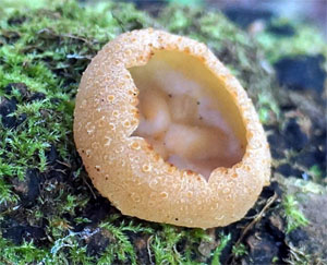 Skropstainā kausainīte Porotheleum fimbriatum , sažuvusi; augusi uz oša kritalas, 2017 . Komentēt (0) Foto: Ivars Leimanis