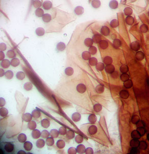 Glītās lampītes Lamproderma pulchellum sporas ar fokusu uz malām; 1000x palielinājums, 2024 . Komentēt (0) Foto: Julita Kluša