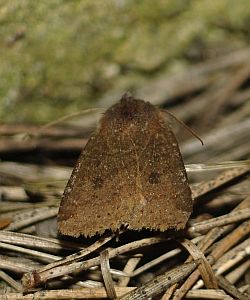 Rūsganā skābeņpūcīte Cerastis leucographa maskējas uz zemes pie priežu mizas, 2015.