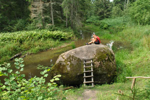 Spuņņu akmens pie Viesatas upes tik augsts, ka jālieto trepes, lai tiktu augšā, 2016.