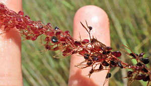 Parastās pūslenes Utricularia vulgaris stublājs ar diegveidīgajām lapām, pie kurām kukaiņu ķeramie pūslīši, 2012.