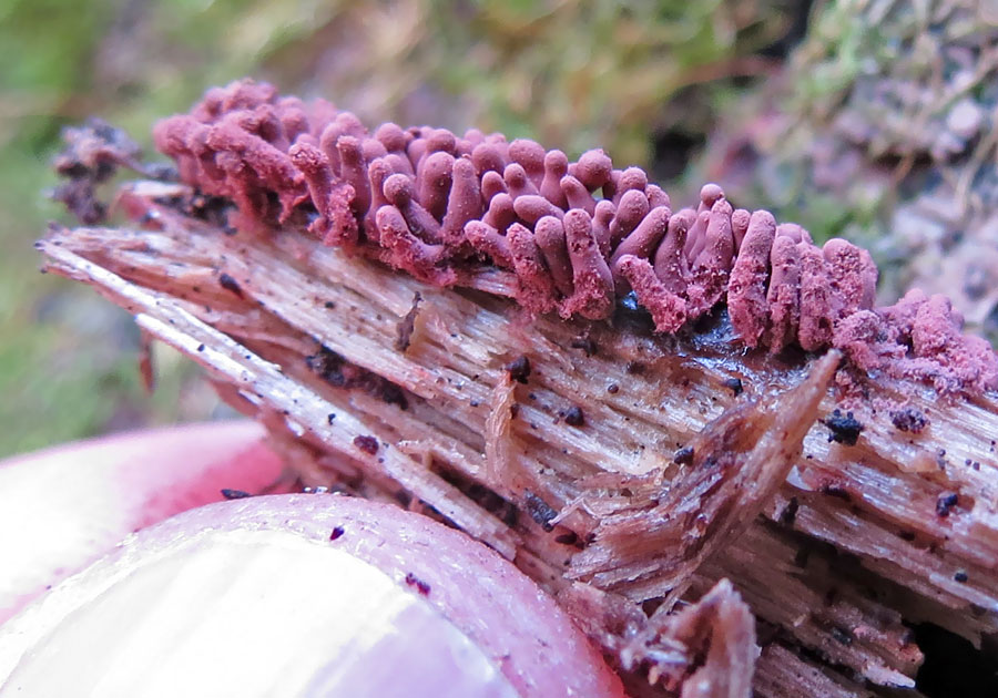 Sprodzīte, kam jau sāk nolobīties perīdijs; uz trupošas koksnes gabaliņa