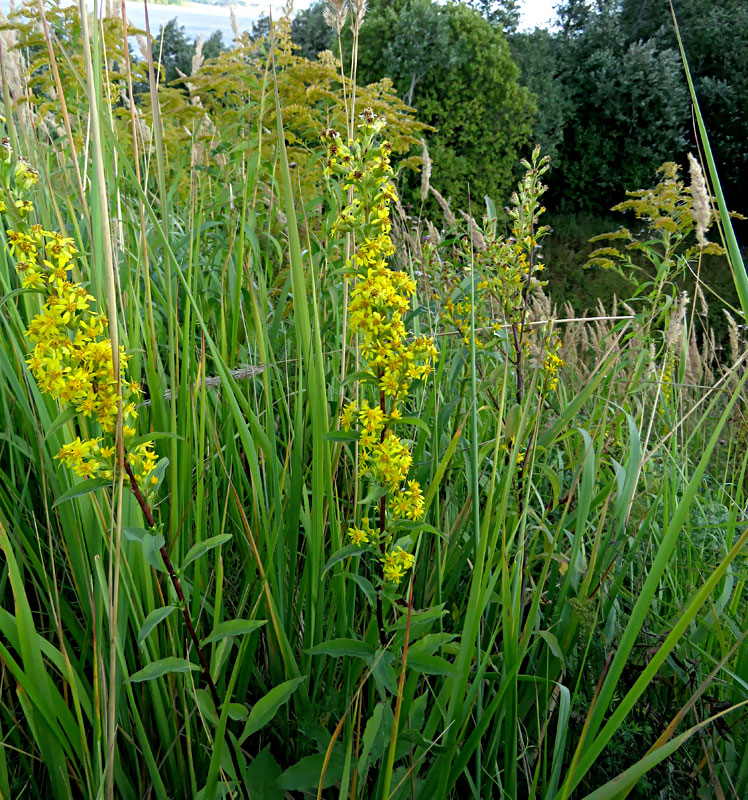 Ziedoša dzeltenā zeltgalvīte Solidago virgaurea; fonā pārziedējusi Kanādas zeltgalvīte Solidago canadensis