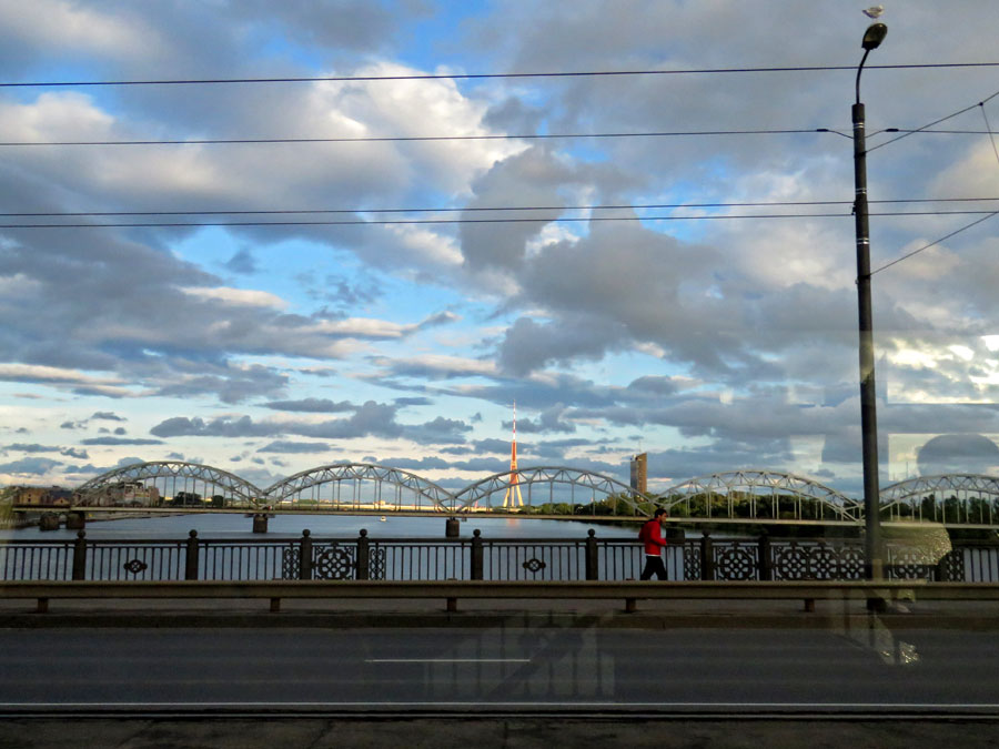 Tilti un mākoņi caur sabiedriskā transporta logu Rīga un apkaime, Rīga, Rīga, Zemgales prp., Torņakalns, vasara, 30.07.2015. Redzamie objekti : Daugava, Rīgas dzelzceļa tilts, Akmens tilts, Zaķusalas TV tornis: skatu vieta Tēmas : Upes, kanāli, strauti ; Ūdens ; Mākoņi ; Tilti