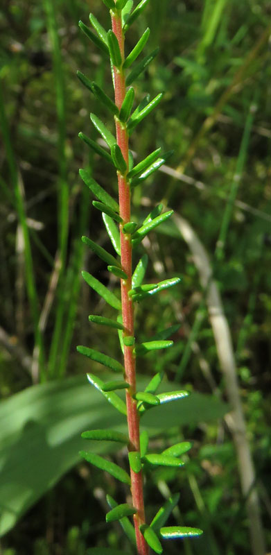 Melnās vistenes Empetrum nigrum īsās adatveida lapas izkārtotas pa spirāli ap stumbru