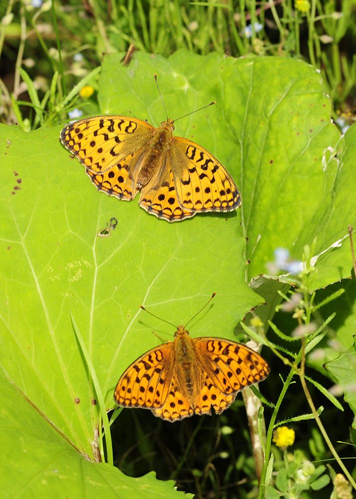 Lielo atraitnīšu raibeņu Argynnis adippe pāris saulītē (mātīte augšā, tēviņš apakšā)