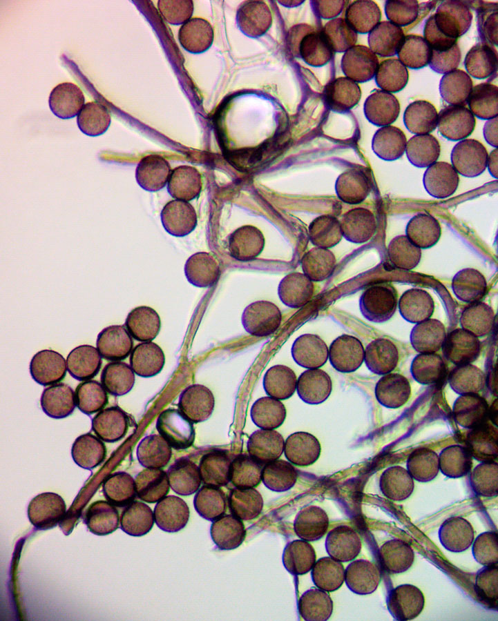 Brūnās kurkulītes Colloderma robustum kapilīcijs un sporas 400x palielinājumā
