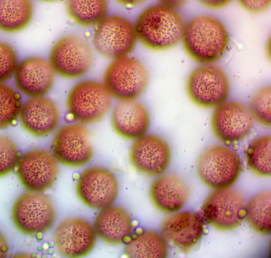 Sērdzeltenā pumpurīte Nannengaella sulphurea; kārpainās sporas 1000x palielinājumā