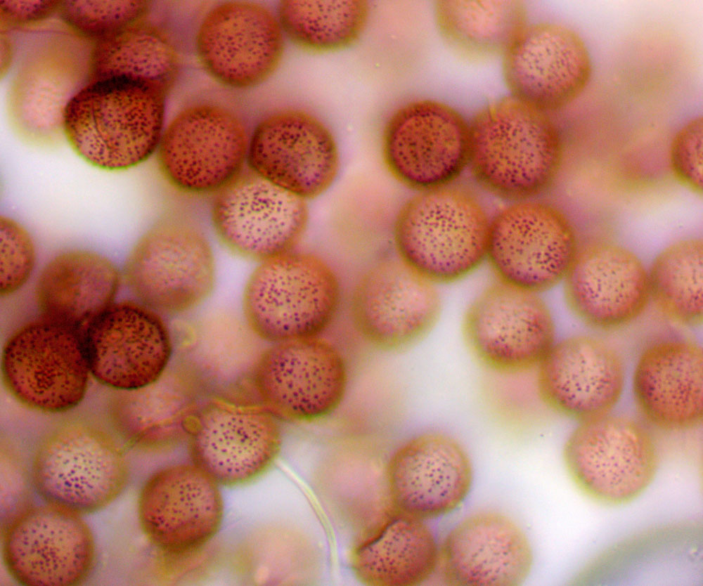 Brūnganā olīte Diderma simplex; sporas un caurspīdīgs kapilīcija pavediens 1000x palielinājumā