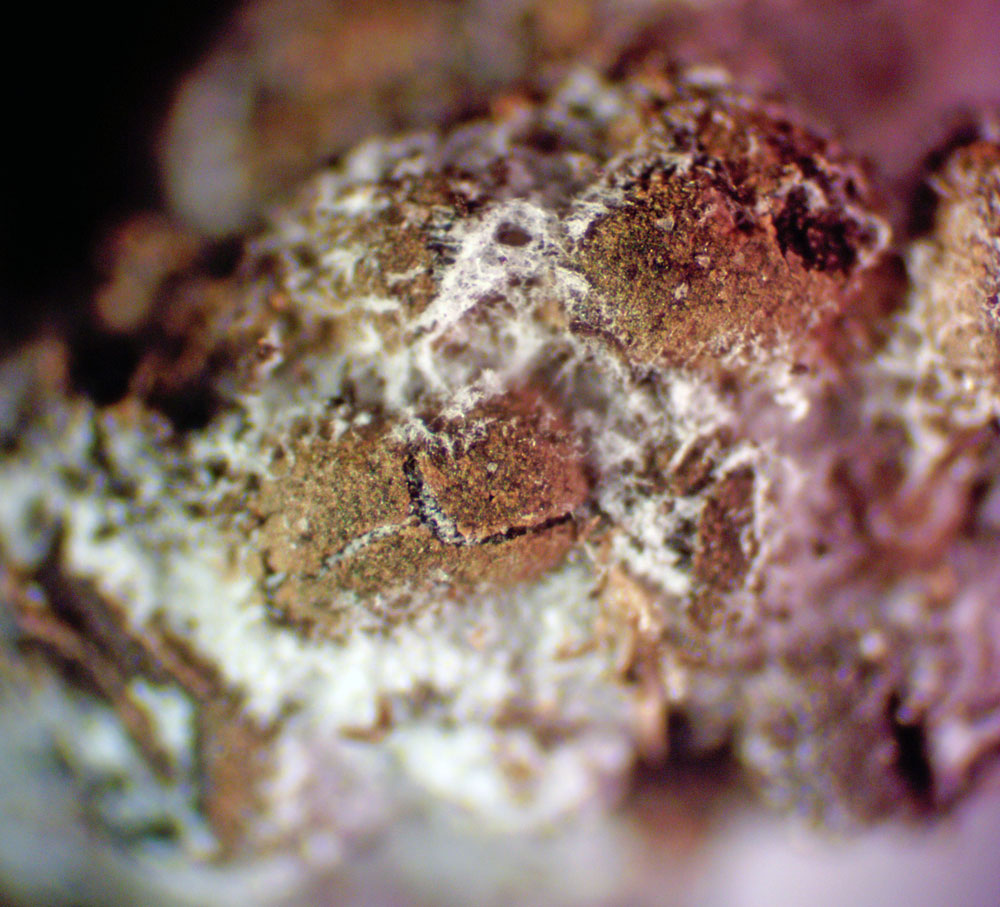 Brūnganā olīte Diderma simplex, augļķermeņa virsma tuvplānā (ar pelējumu)