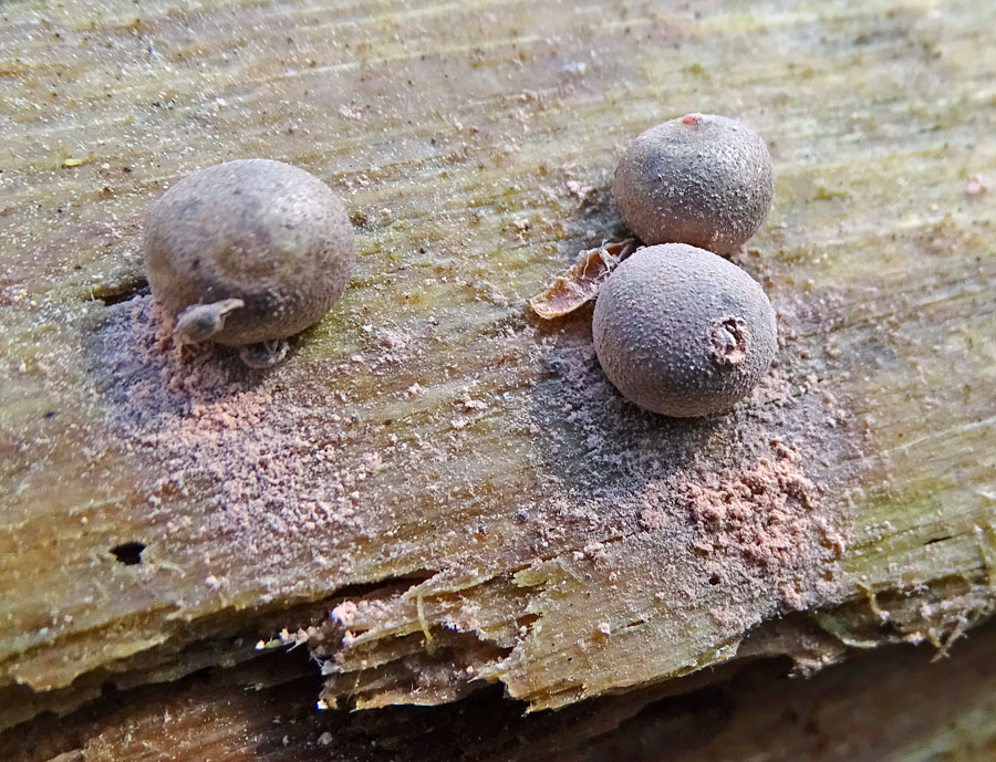 Dzintarainā vilkpienaine Lycogala succineum sporu stadijā uz priedes kritalas