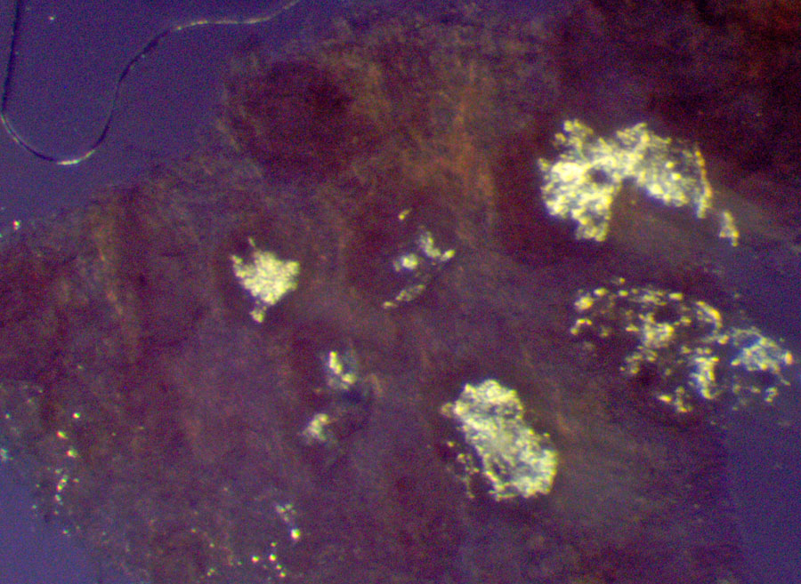 Dzintarainā vilkpienaine Lycogala succineum polarizētajā gaismā ar izgaismotiem pūslīšu kristāliem