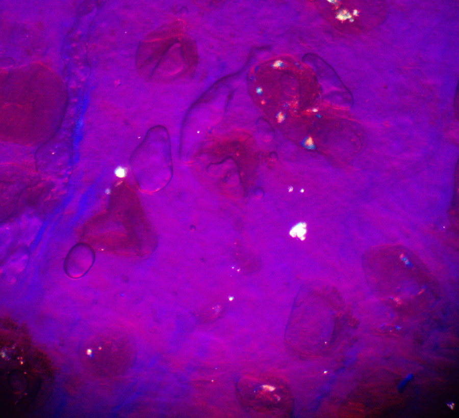Medainajai vilkpienainei Lycogala melleum ir maz kristālu (tie polarizētā gaismā izgaismojas)