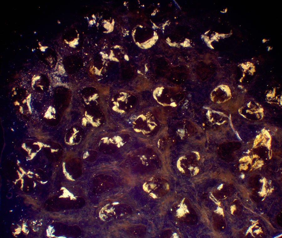 Leoparda vilkpienaine Lycogala leopardinum polarizētā gaismā ar izgaismotiem kristāliem