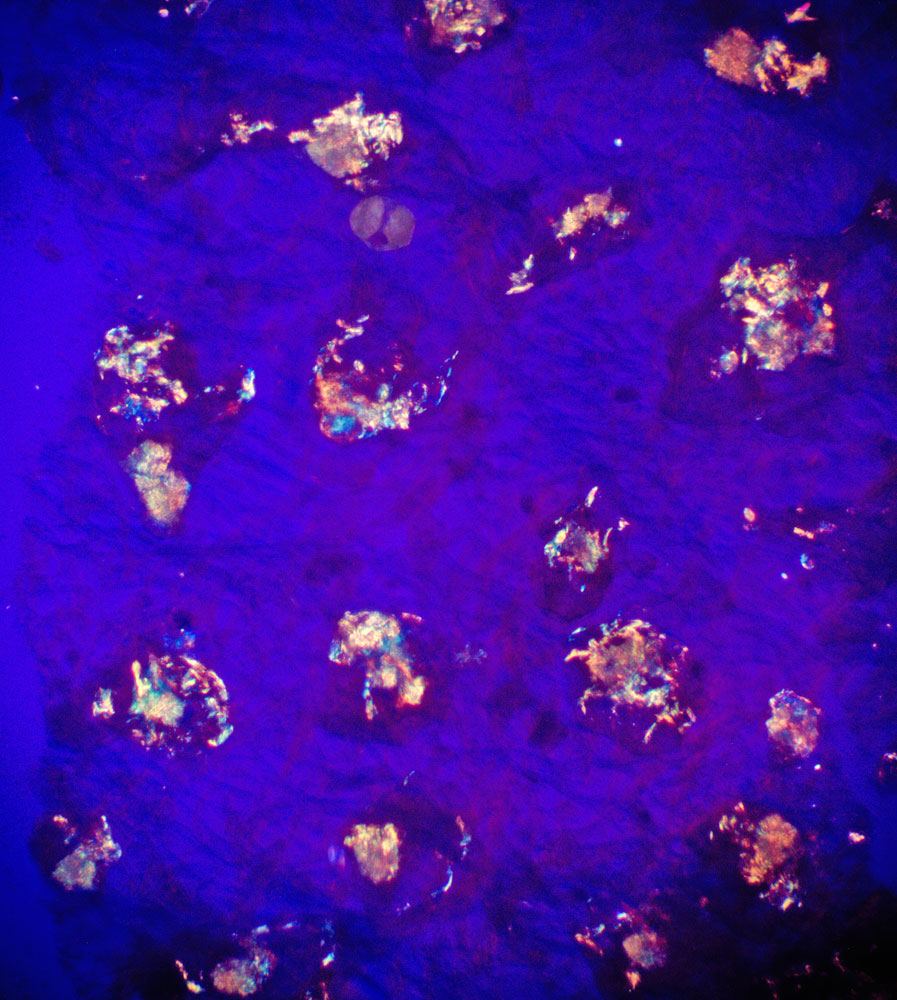 Trūcīgā vilkpienaine Lycogala miserum bagāta ar kristāliem, kas redzami polarizētajā gaismā