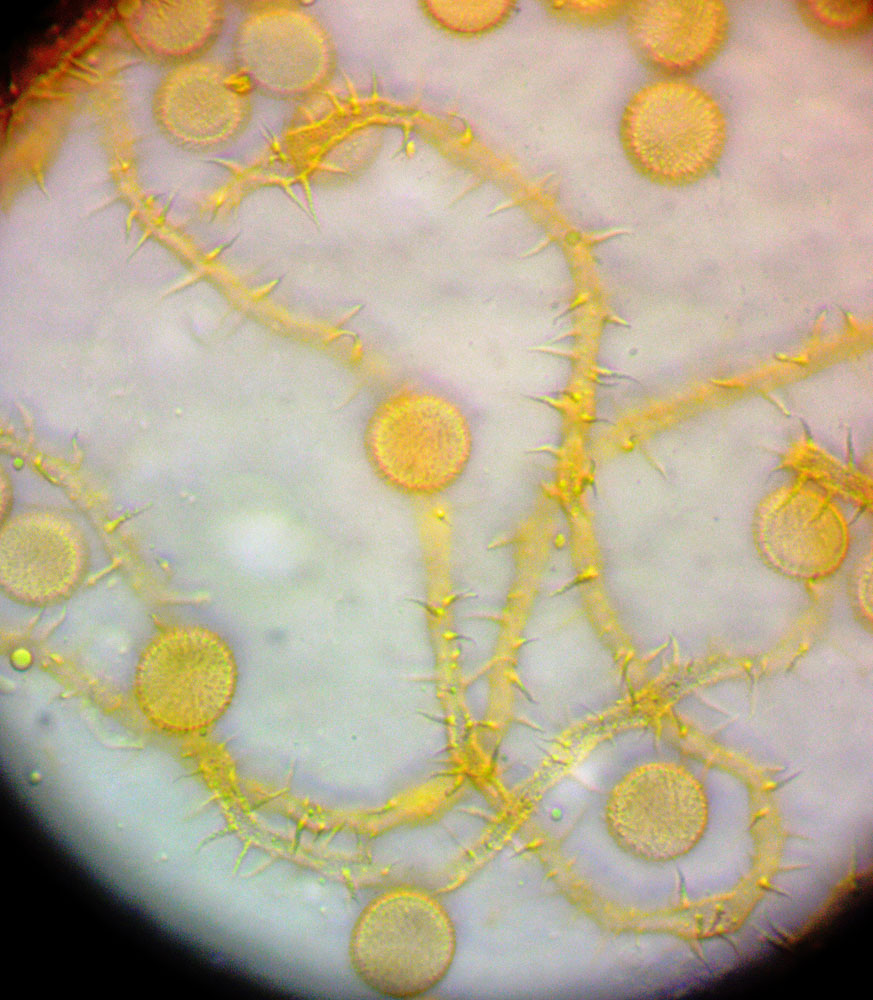 Zeltsporu čūskaines Ophiotheca wrightii sporas un kapilīcijs 1000x palielinājumā
