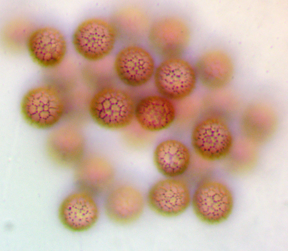Lapu vālenīte Stemonitis foliicola; sporas ar tīkliņu, 1000x palielinājums